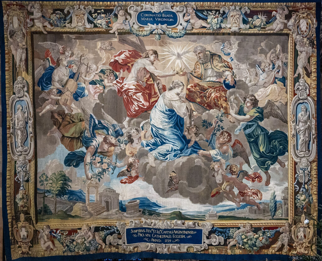 Sait-on que la glorification est l’un de ces thèmes ? Regardez le cartouche qui orne le bas de chaque tapis et vous y verrez un texte latin qui, en trois lignes seulement, contient deux superlatifs à la gloire de l’acquéreur, le Grand Chapitre « très illustre » et « très vénérable ». Chacun de ses tapis rend hommage aussi à Richelieu, le commanditaire, dont les armoiries ornent toute la partie supérieure que rehausse d’ailleurs un jeu d’initiales savamment entrelacées. La louange des hommes n’est qu’un prélude à celle de la Vierge qui culmine dans la dernière tenture. Entourée d’une multitude d’angelots voletant dans les nuées et dont certains jouent de la musique, la Vierge y est couronnée par Dieu le Père et son Fils en présence de l’Esprit Saint. Observez-en la partie inférieure de près : elle présente des motifs qui renvoient au culte de la Vierge que de nombreux symboles valorisent à l’envi, comme le miroir de justice, le puits de sagesse…