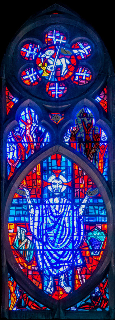 Levons encore les yeux. Au centre d’une rosace un agneau tient par sa patte antérieure une croix où flotte la bannière du ressuscité. Il est vrai qu’il faut un effort pour la distinguer. De sa gorge s’écoule à flots le sang qui emplit un calice doré marqué d’une croix. Il représente le Christ en agneau pascal égorgé pour notre salut, symbole théologique bien connu qui n’est pas sans renvoyer à l’Agneau mystique de Van Eyck. Les six oculi sont tous dotés de croix à deux traverses inégales dont la couleur bleuâtre se détache du fond orangé et dont la position change en fonction de l’oculus. Pour un peu on étoufferait sous une telle surcharge de motifs et de couleurs. Bref, un vitrail qui a de quoi fasciner et déranger, car s’inscrivant dans une tradition tout en rompant en visière avec elle.