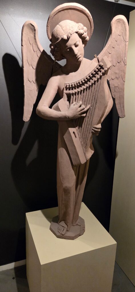 L’exposition est habilement répartie en trois parties qui sont autant de temps forts : l’Alsace, la France et l’archéolutherie. Elles permettent des déambulations de l’une à l’autre avec des comparaisons et approfondissements successifs. Il faut dire que le thème des anges musiciens était en vogue au Moyen Âge : rien qu’à Strasbourg il apparaît à plusieurs reprises à la cathédrale, à l’église protestante Saint-Pierre-le-Jeune et même sur les murs de ce qui fut il y a peu la pharmacie du Serpent.