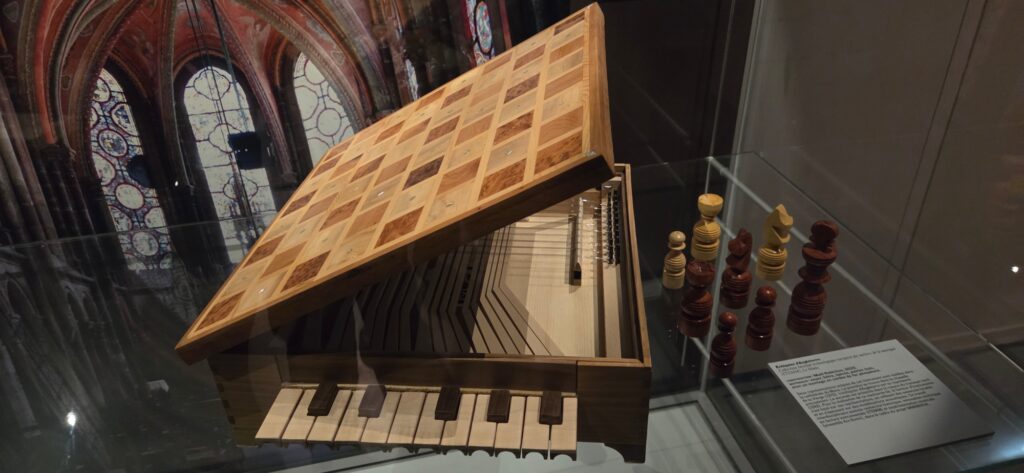 La troisième partie est peut-être la plus intéressante. Consacrée à l’archéolutherie, science expérimentale qui tente de restituer des instruments médiévaux disparus, elle nous livre de belles perspectives intellectuelles. D’abord par la fidélité des rendus, grandeur nature qui nous permet de les appréhender dans leurs détails à partir de recherches historiques, organologiques et picturales. Mais la tâche est rude pour ces passionnés auxquels elle offre peu de réponses. De fait, reproduire l’apparence extérieure est aisée, mais quid de sa partie interne qui demeure cachée à la vue ? On en est donc réduit à des hypothèses et peu sûr que le son soit fidèle à l’original, les documents manuscrits décrivant leur réalisation étant rares. C’est le cas pour les rebabs, rebecs, guiternes et même les harpes (en quoi étaient faites les cordes en ces temps lointains ?). Surprise de taille : un échiquier aux anges, dit échiquier d’Angleterre car prétendument rapporté par un ambassadeur de ce pays. Il s’agit effectivement d’un jeu d’échecs avec son plateau de 64 cases et ses pièces. Mais son tablier s’ouvre comme un couvercle à 45° et révèle une boite avec un jeu de cordes qui vibrent quand elles sont actionnées par un clavier extérieur. Stupéfiant ! Toutes ces tentatives sont dues principalement à Olivier Féraud qui travaille à partir d’une fresque (vers 1420) ornant une voûte de la chapelle de Saint-Bonnet-le-Château (Loire).