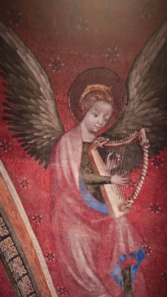 Dans la seconde partie, on admire surtout les belles reproductions de peintures d’anges musiciens. Elles ornent, et c’était attendu, maints édifices religieux de nos provinces (Essonne, Bretagne…), mais aussi, et c’est plus surprenant, des bâtiments comme des palais ou des monuments funéraires, destinés à perpétuer la mémoire des défunts. Et de saisir la différence de facture d’une série à l’autre, les goûts changeant avec le temps, mais les couleurs étant toujours aussi travaillées et les visages aussi… angéliques. Parfois les yeux sont fermés comme s’ils étaient en extase. Un cas intéressant interloque : un ange joue de deux harpes à la fois ! En fait, il n’en est rien : le peintre ayant mal réussi sa première version n’est plus arrivé à l’effacer, car ayant travaillé avec de la cire et du jaune d’œuf. L’effet n’en est que plus troublant.