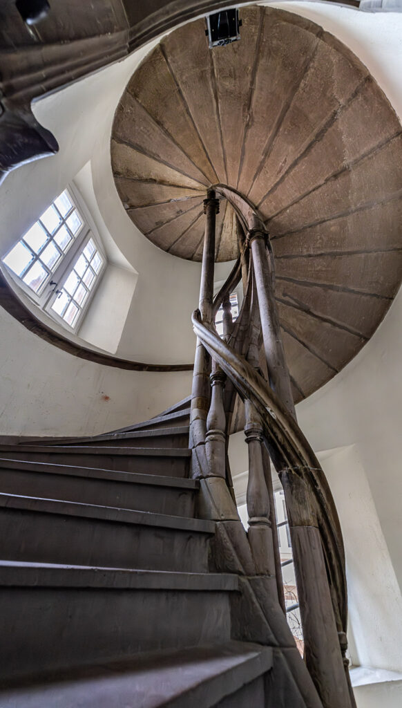 Après la montée de quelques marches sur le bel escalier à vis qui laisse une impression de grâce aérienne et de légèreté,  on arrive à la chapelle, très intime du lieu. Rehaussée d’un autel contenant des reliques, elle est dotée d’un long et beau vitrail de Tristan Ruhlmann centrée sur la Cène avec des épis de blé d’un jaune doré et des grappes de raisin, symboles du pain et du vin du dernier repas pris en commun par le Christ et ses disciples. On y perçoit la présence de la jeunesse estudiantine à une batterie qui remplace l’orgue traditionnel.