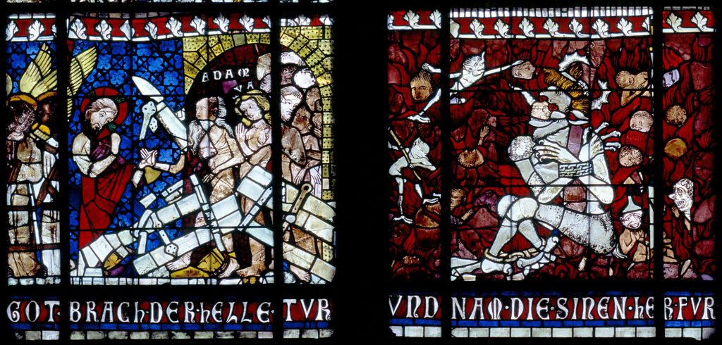 Hinter der Gesamtverglasung steckt eine großartige Konzeption, die mit rhetorischen Mitteln wie motivischen Wiederholungen, Bezugnahmen und Rückschlüssen arbeitet und sogar intermedial Schriftlichkeit und Poesie mit einbezieht. Denn zahlreiche Szenen wurden mit volkssprachlichen, d.h. deutschen Inschriften versehen. Man kann sich lebhaft vorstellen, wie die dargestellten Inhalte in vergangenen Zeiten Betrachtern vermittelt wurde.